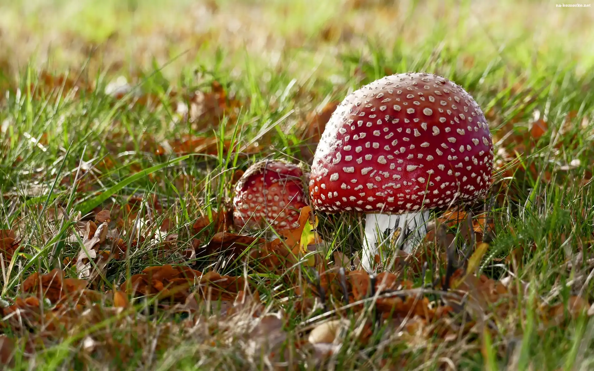 Liście, Grzyby, Muchomory, Łąka, Trawa na Komórkę