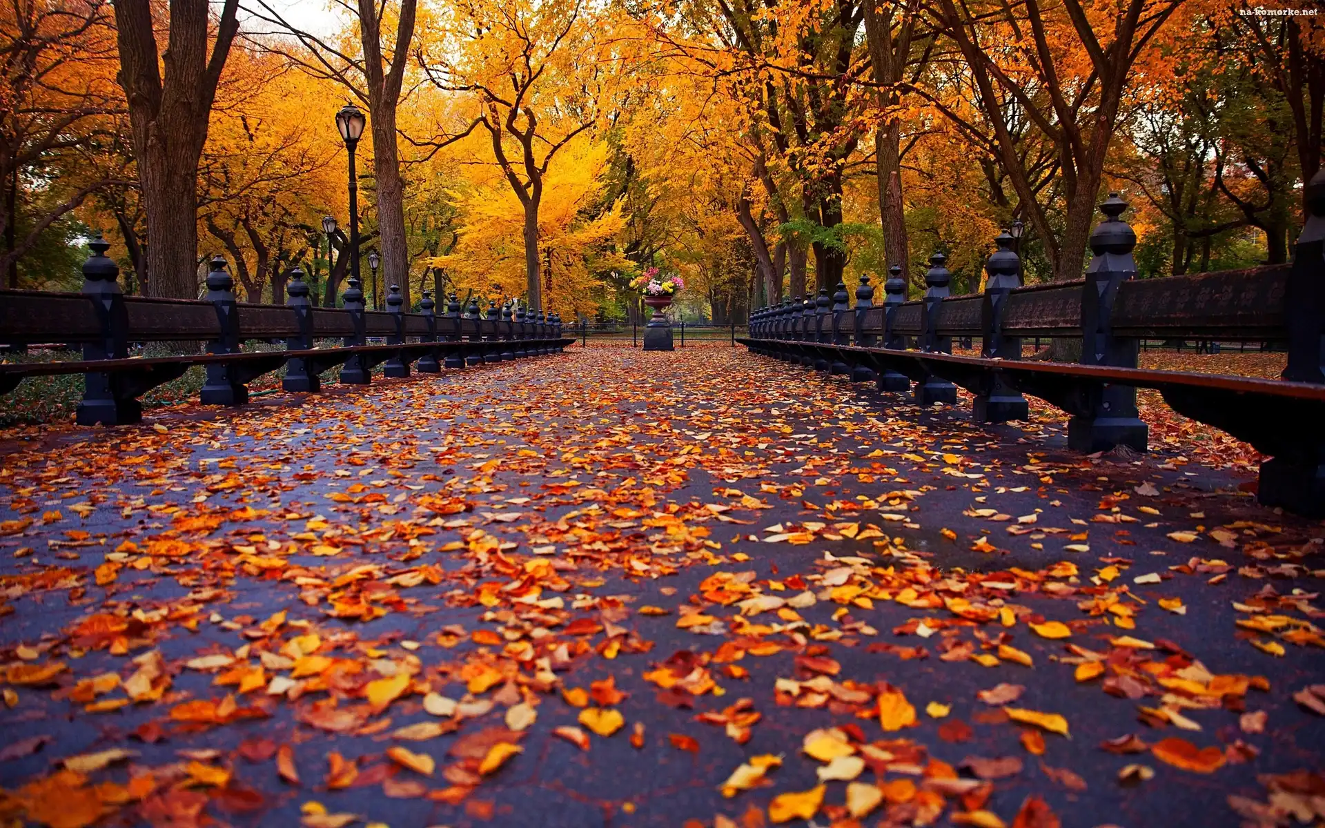 Liście, Park, Jesień, Kwiaty, Ławki, Gazon na Komórkę