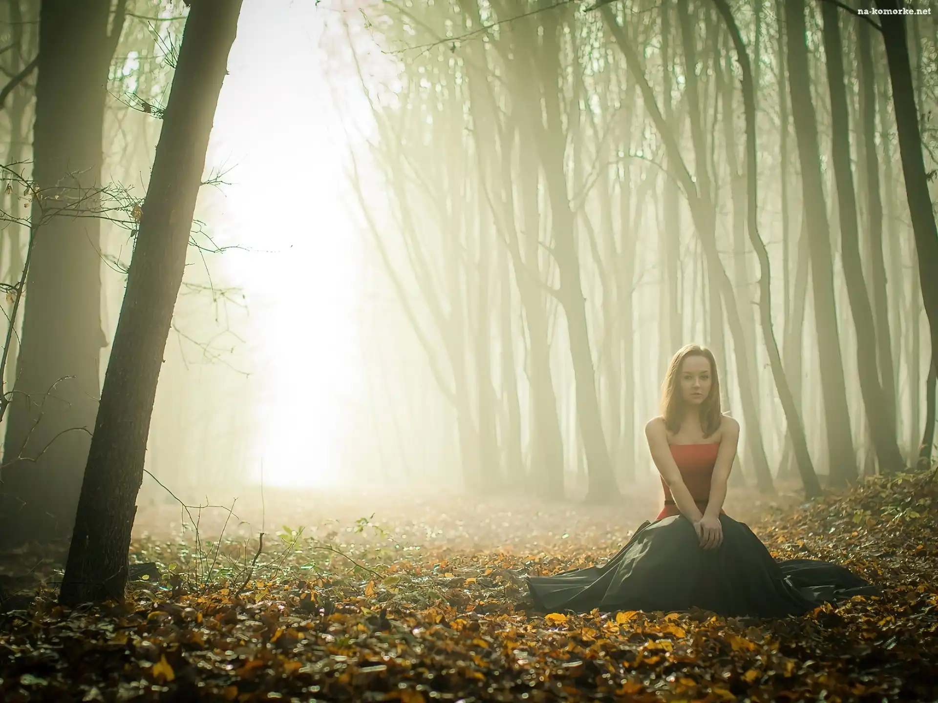 Liście, Mgła, Jesień, Odpoczynek, Drzewa, Kobieta na Komórkę