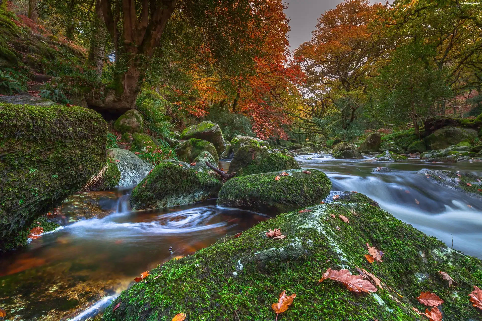 Liście, Park, Kamienie, Drzewa, Rzeczka na Komórkę