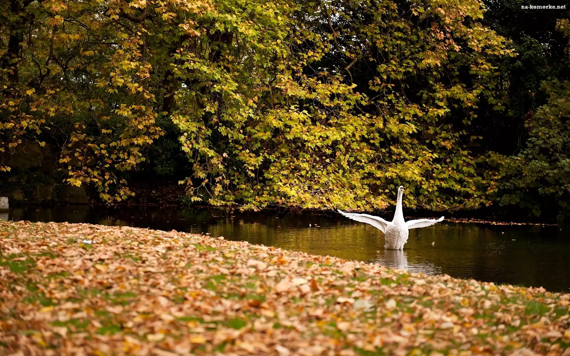 Łabędź, Drzewa, Opadłe, Liście, Rzeka na Komórkę