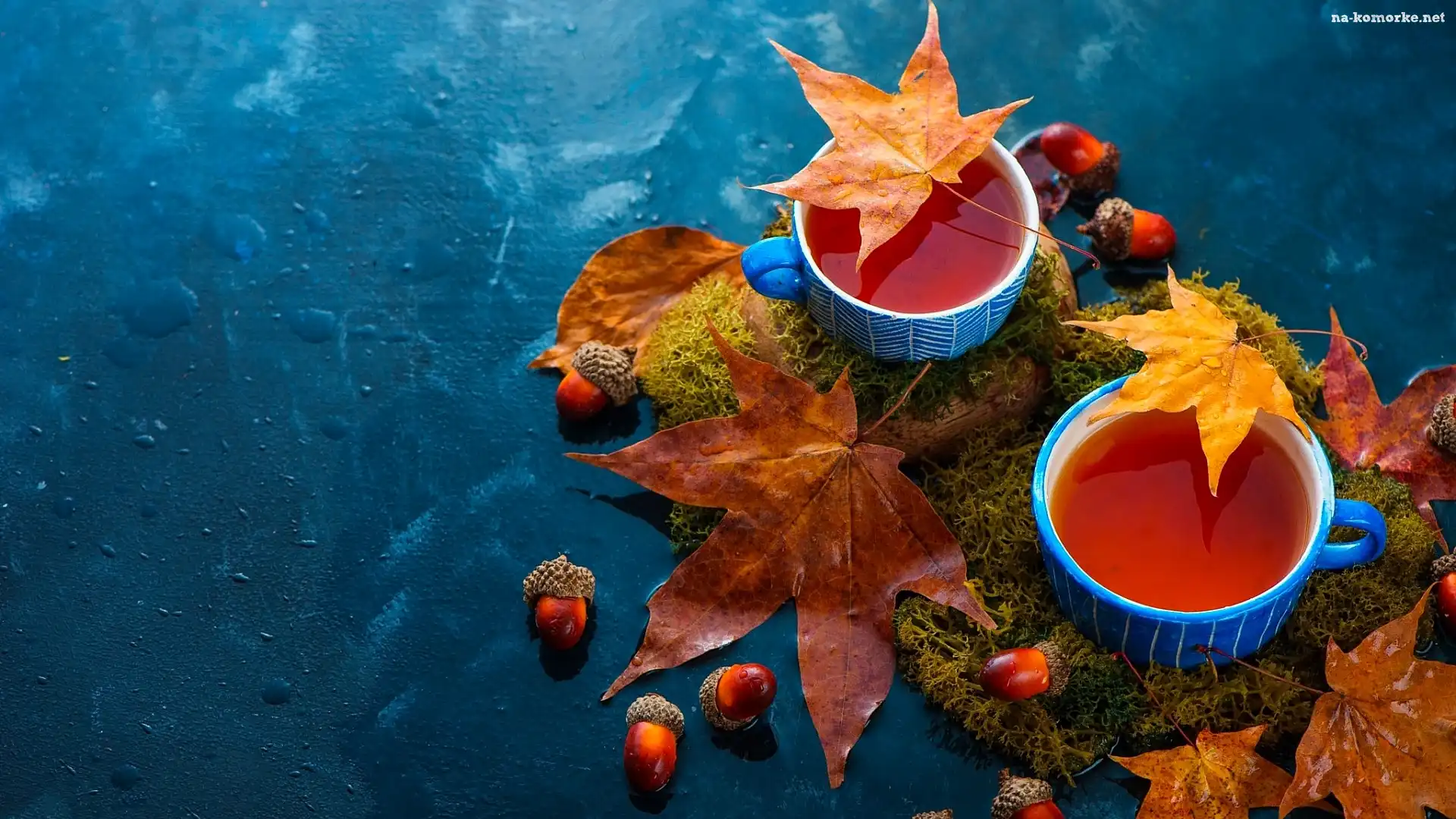 Liście, Niebieskie, Herbata, Mech, Filiżanki, Żołędzie na Komórkę