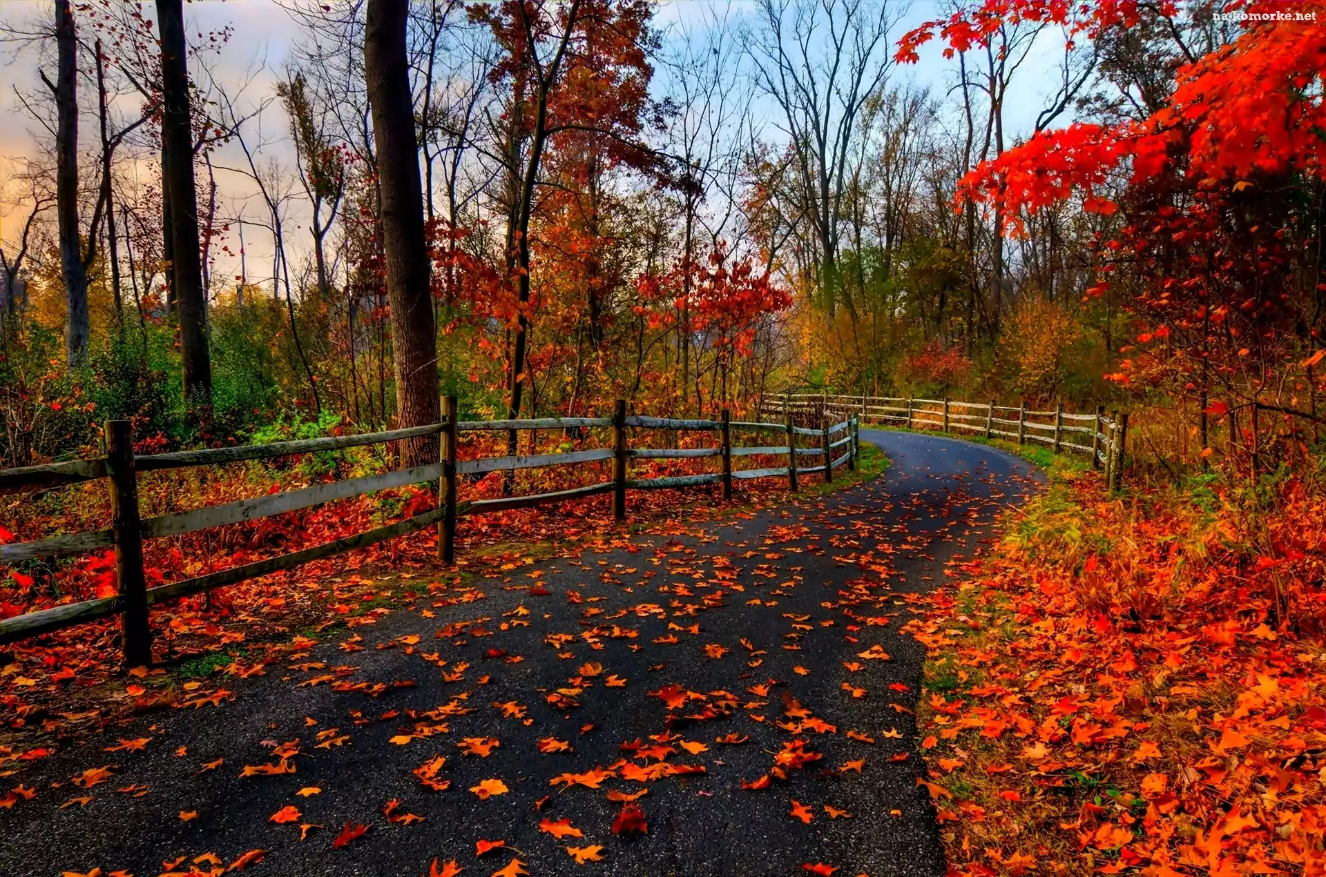 Liście, Las, Droga, Jesień, Czerwone na Komórkę