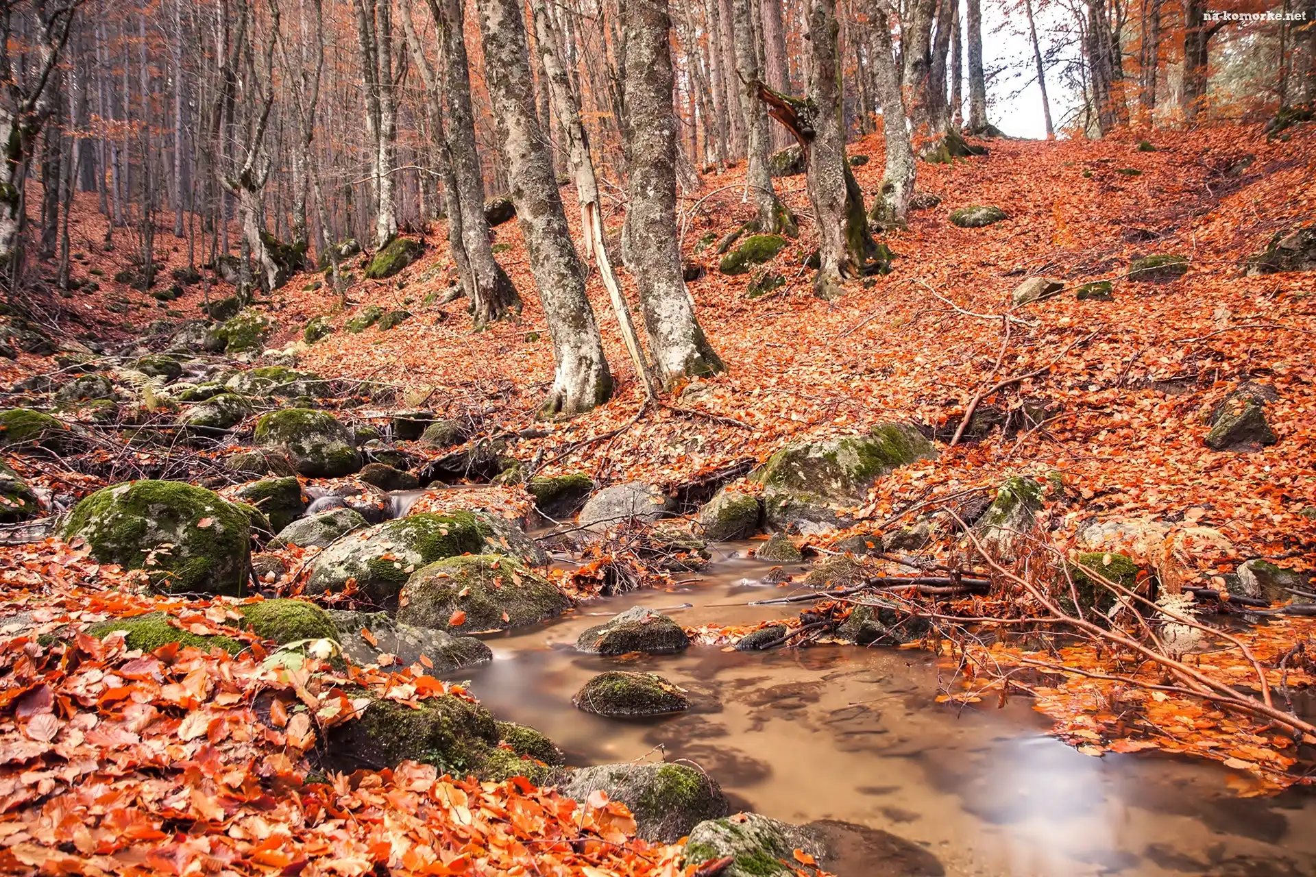 Liście, Rzeka, Las, Kamienie, Jesień, Omszałe na Komórkę