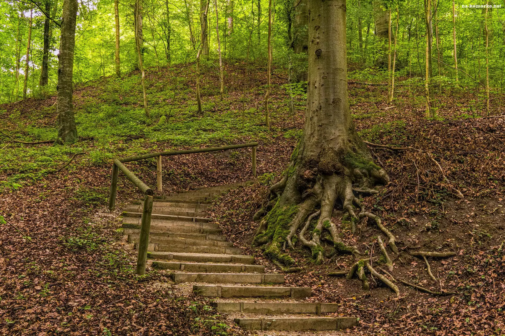 Liście, Drzewa, Las, Schody, Korzenie, Drewniane na Komórkę