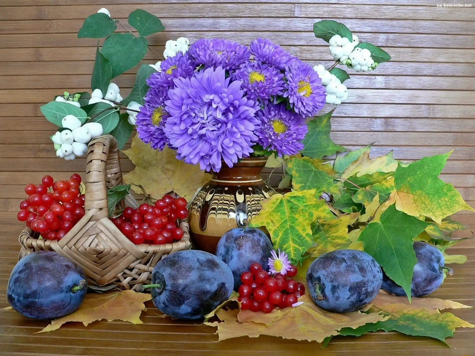 Liście, Bukiet, Astrów, Śliwki, Porzeczki na Komórkę