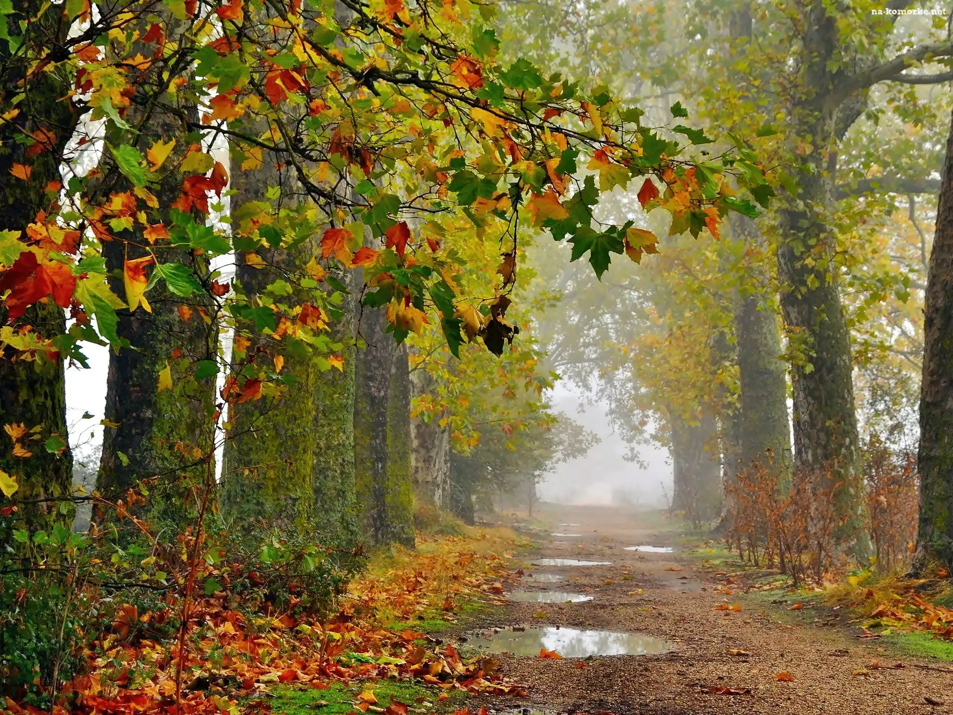 Liście, Jesień, Droga, Mgła, Kolorowe na Komórkę