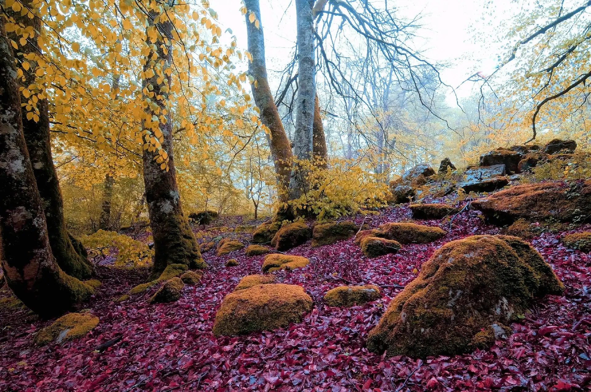 Liście, Jesień, Las, Omszone, Kamienie na Komórkę