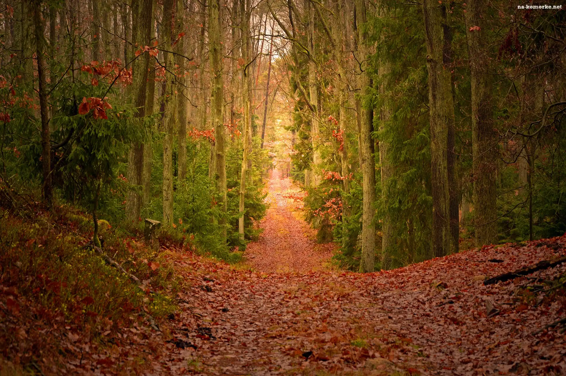 Liście, Las, Jesień, Drzewa, Opadłe, Ścieżka na Komórkę