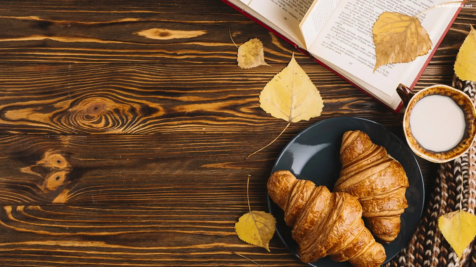 Kubek, Rogaliki, Szalik, Mleka, Deski, Croissanty, Książka, Talerz, Liście na Komórkę