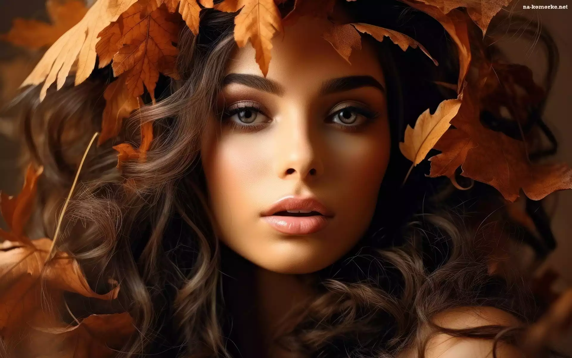 Żółte, Kobieta, Makijaż, Liście, Twarz, Szatynka na Komórkę