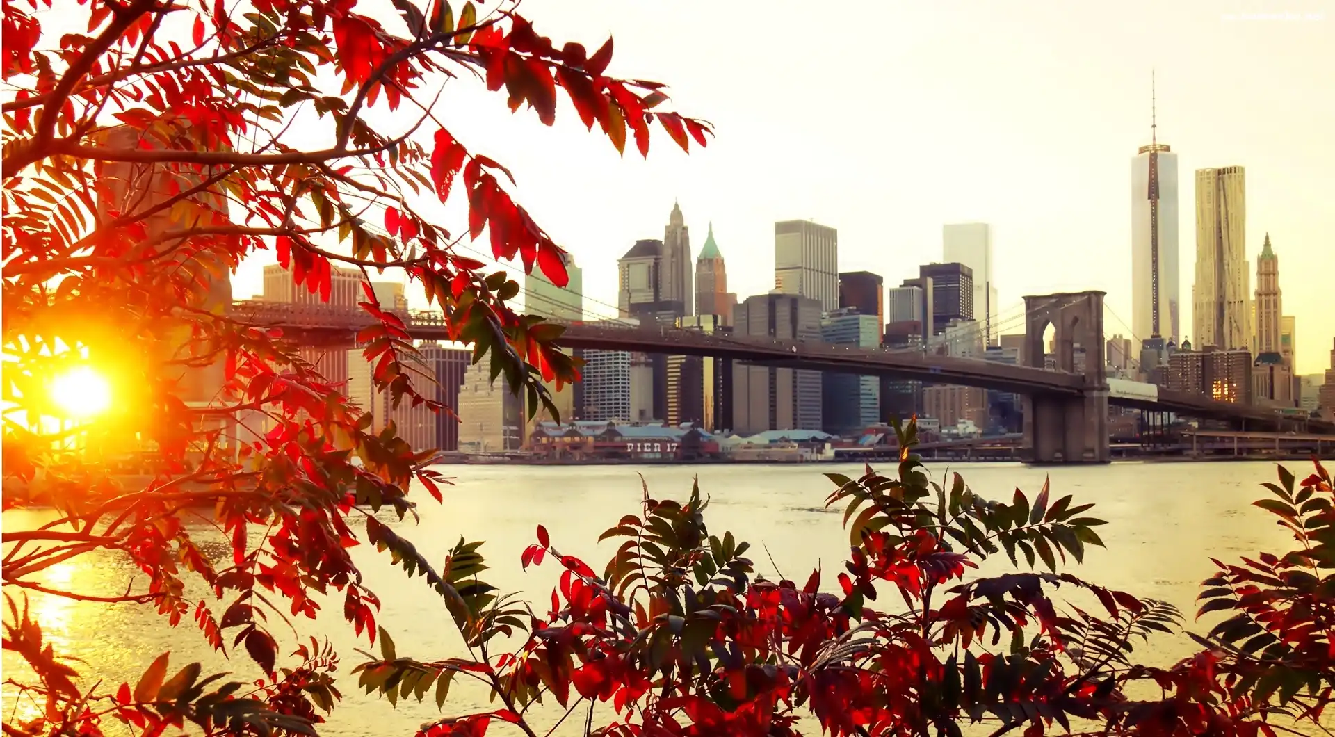 Liście, Most, Rzeka, Wieżowce, Jesienne na Komórkę