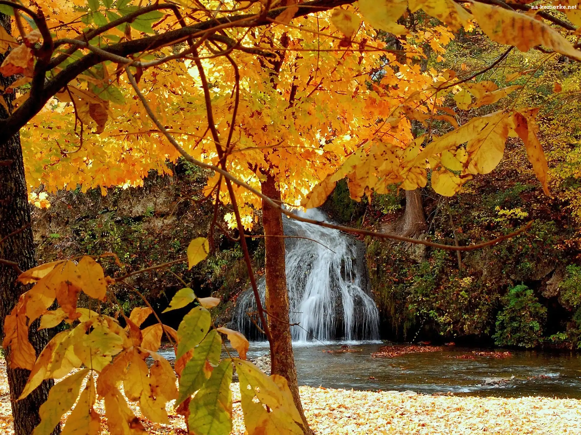 Liście, Jesień, Las, Wodospad, Żółte na Komórkę