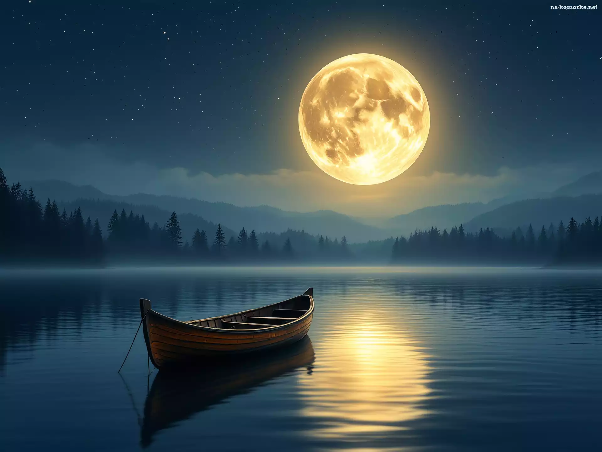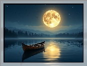 Noc, Łódka, Jezioro, Księżyc, AI na Komórkę
