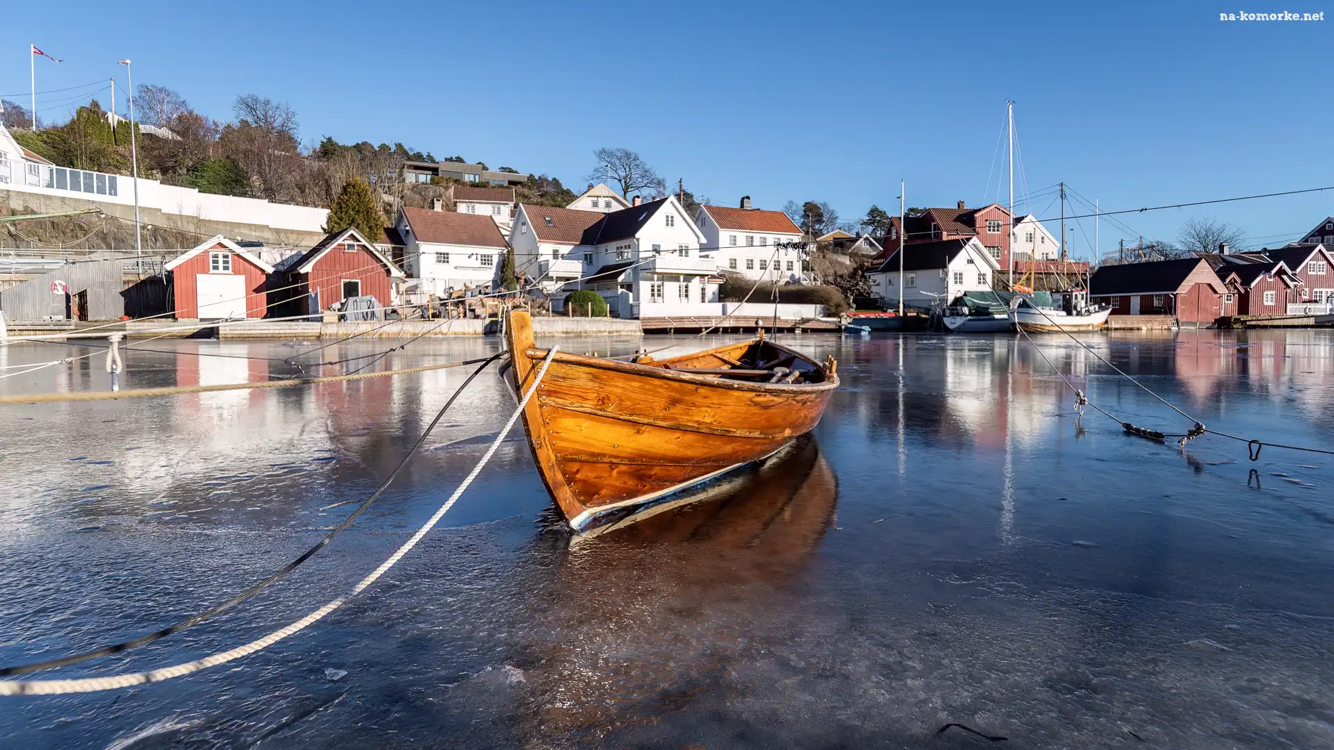 Jezioro, Lód, Domy, Łódka na Komórkę