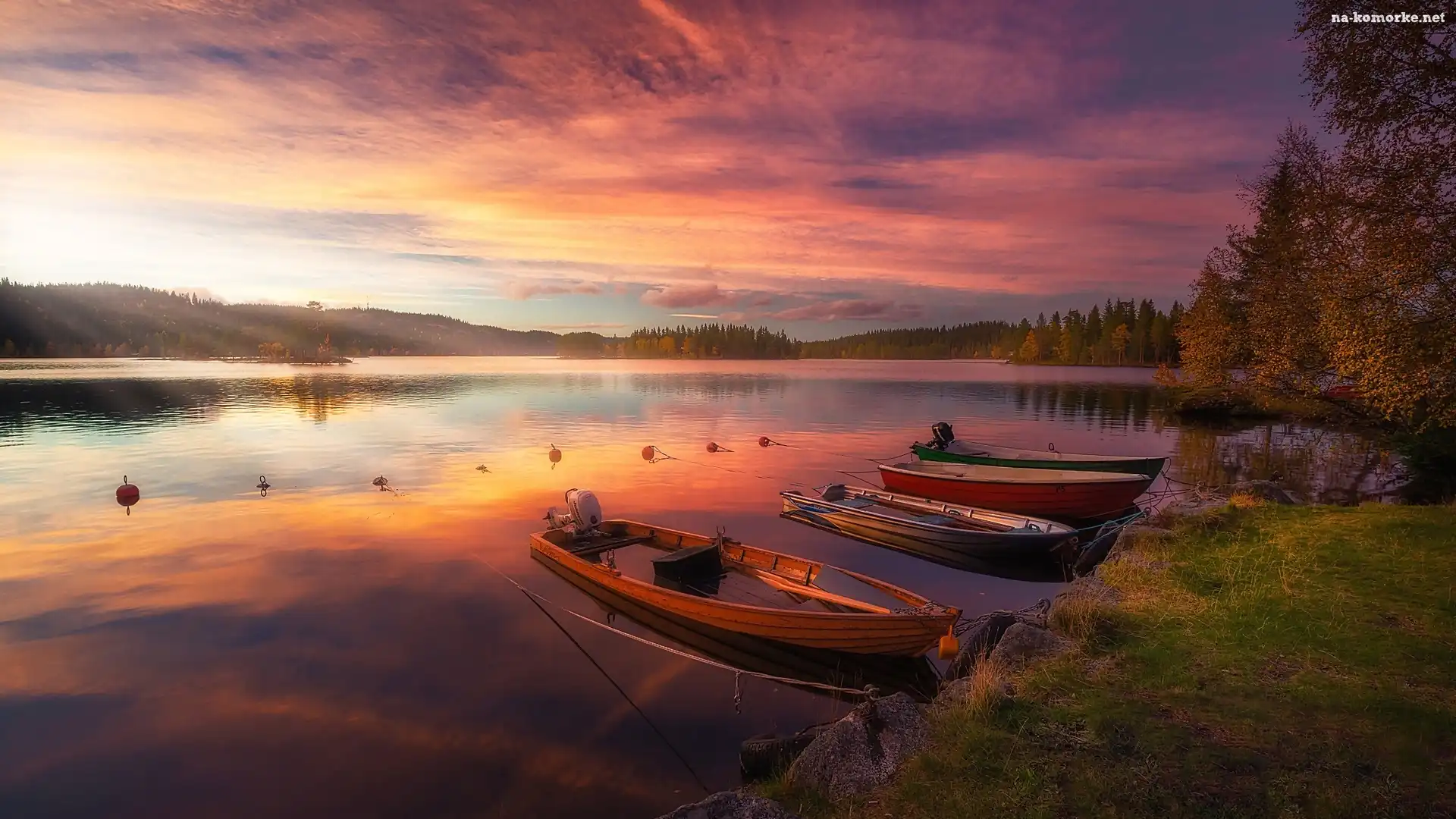 Jezioro, Zachód słońca, Łódki na Komórkę