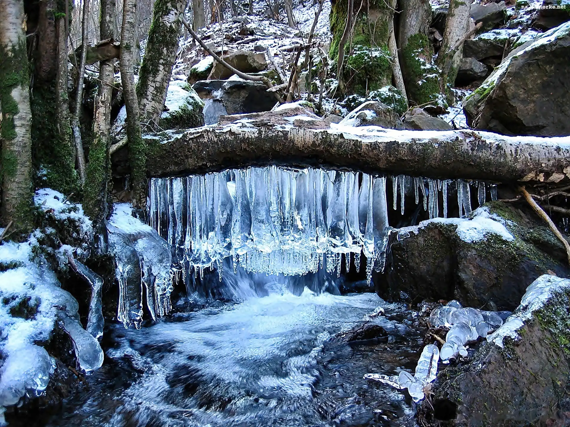 Lodu, Las, Skały, Wodospad, Sople na Komórkę