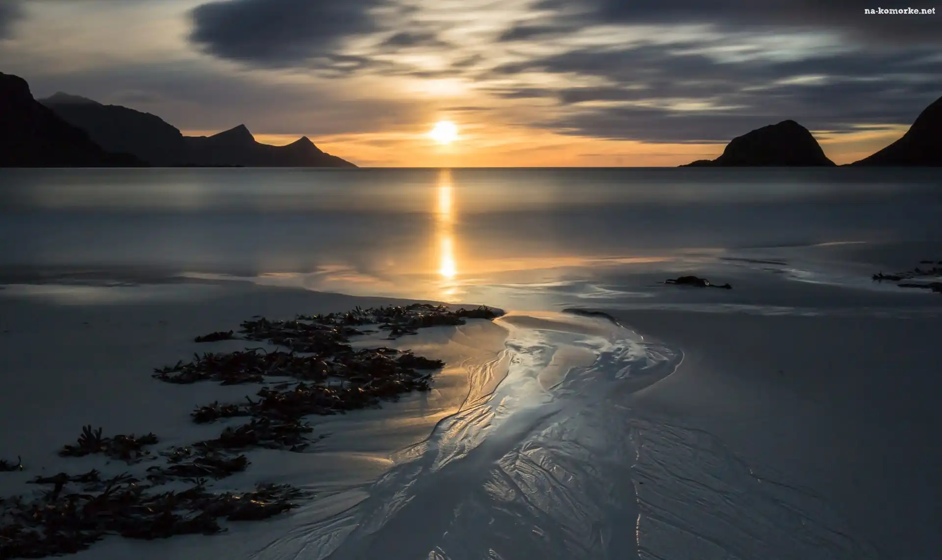Plaża, Lofoty, Norwegia, Góry, Wschody Słońca, Morze na Komórkę