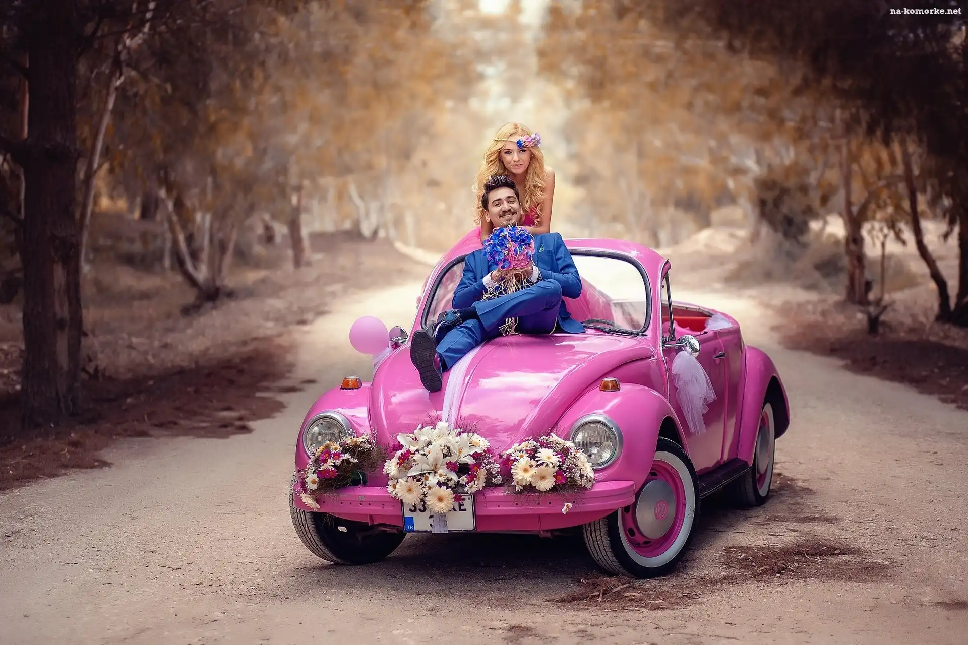 Ślub, Volkswagen Beetle Convertible, Para młoda, Różowy na Komórkę