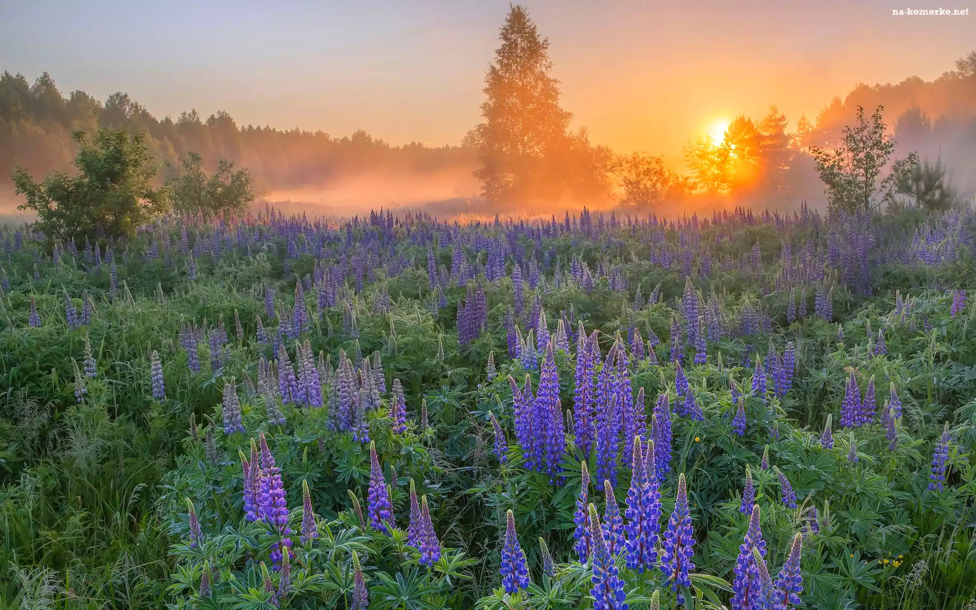 Wschód słońca, Łąka, Łubin, Mgła, Drzewa na Komórkę
