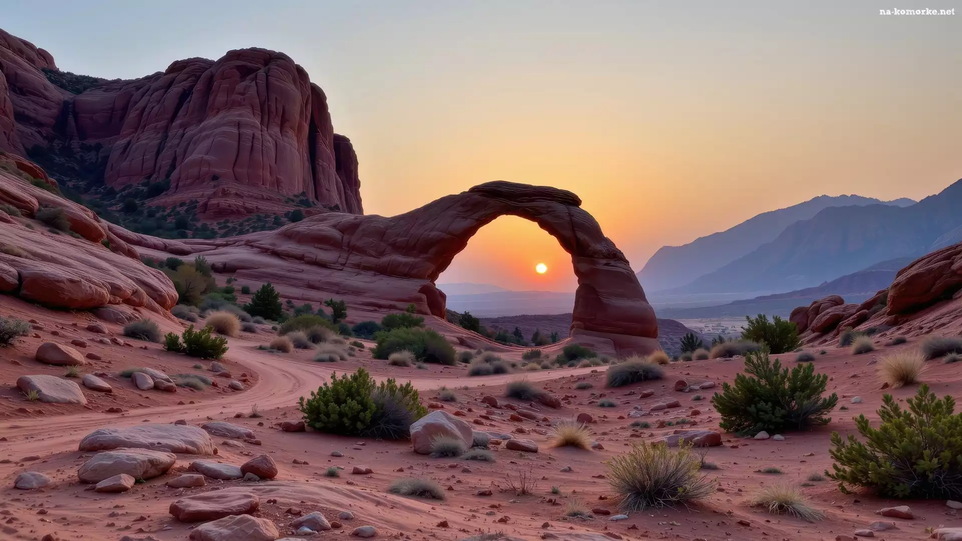 Rośliny, Kamienie, Skały, AI, Wschód słońca, Góry, Łuk na Komórkę