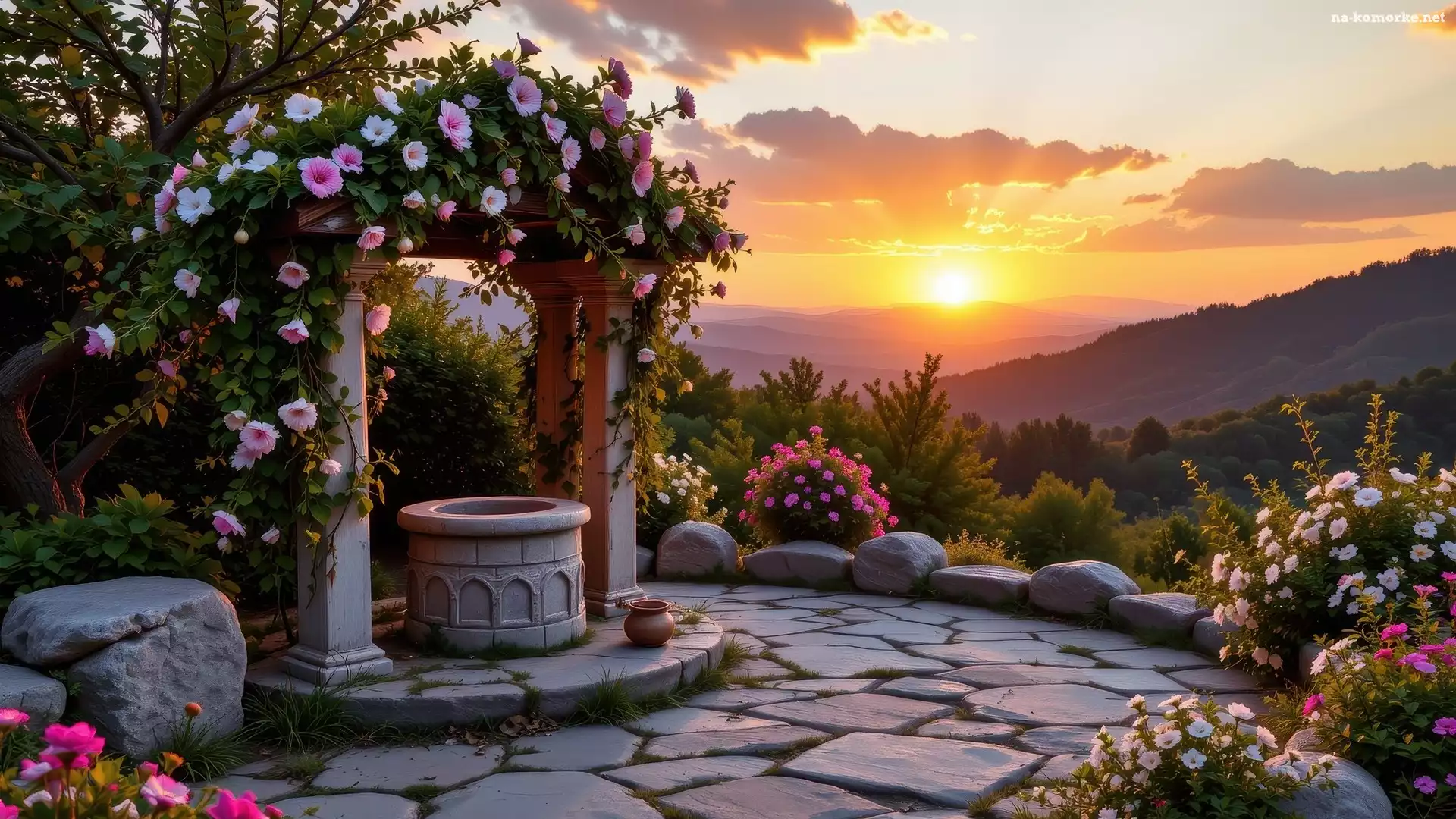 Kamienie, Zachód słońca, Budowla, Góry, Kolorowe, Kwiaty, Łuk na Komórkę