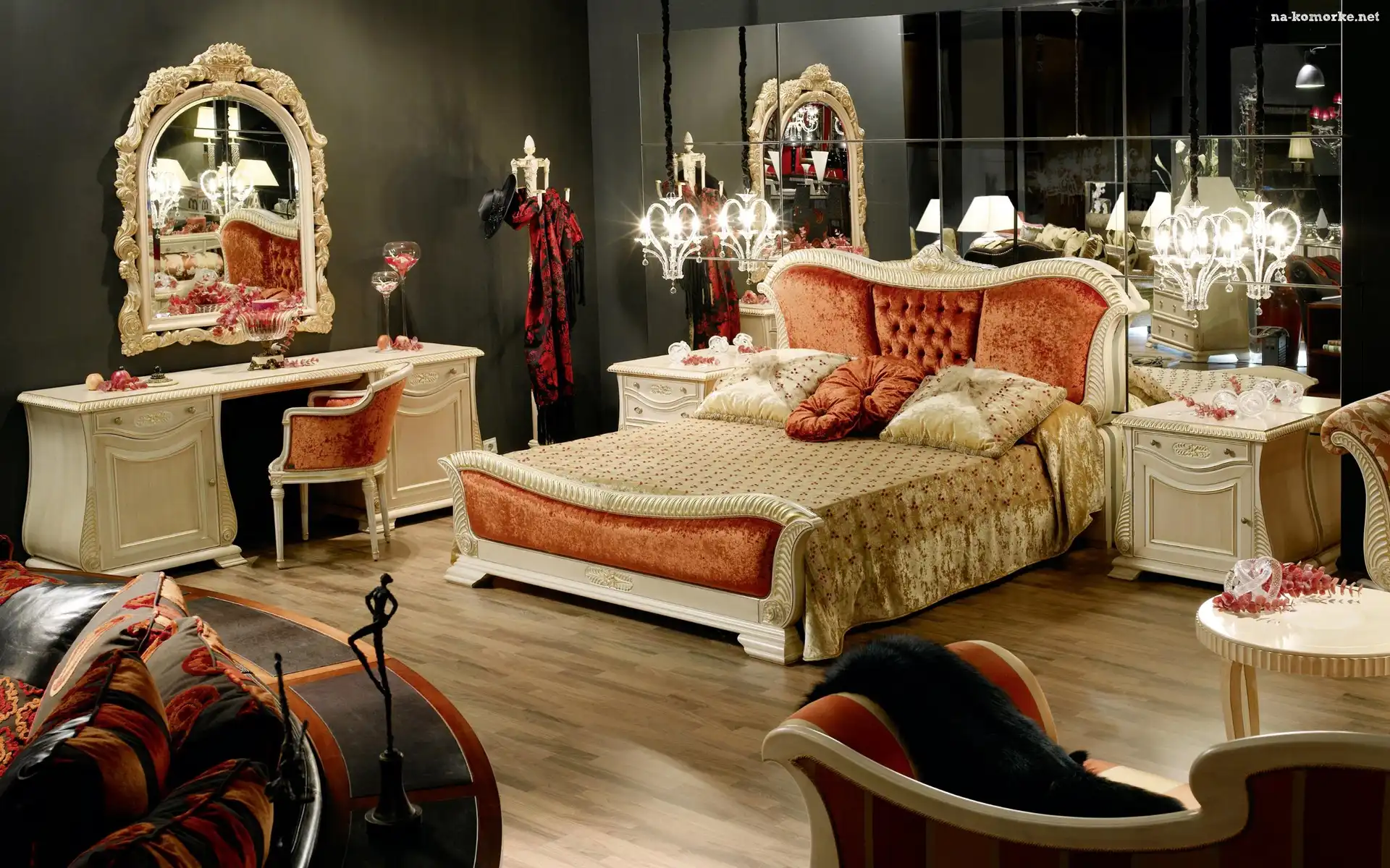 Lustro, Łoże, Sypialnia, Poduszki, Komoda, Lampiony na Komórkę