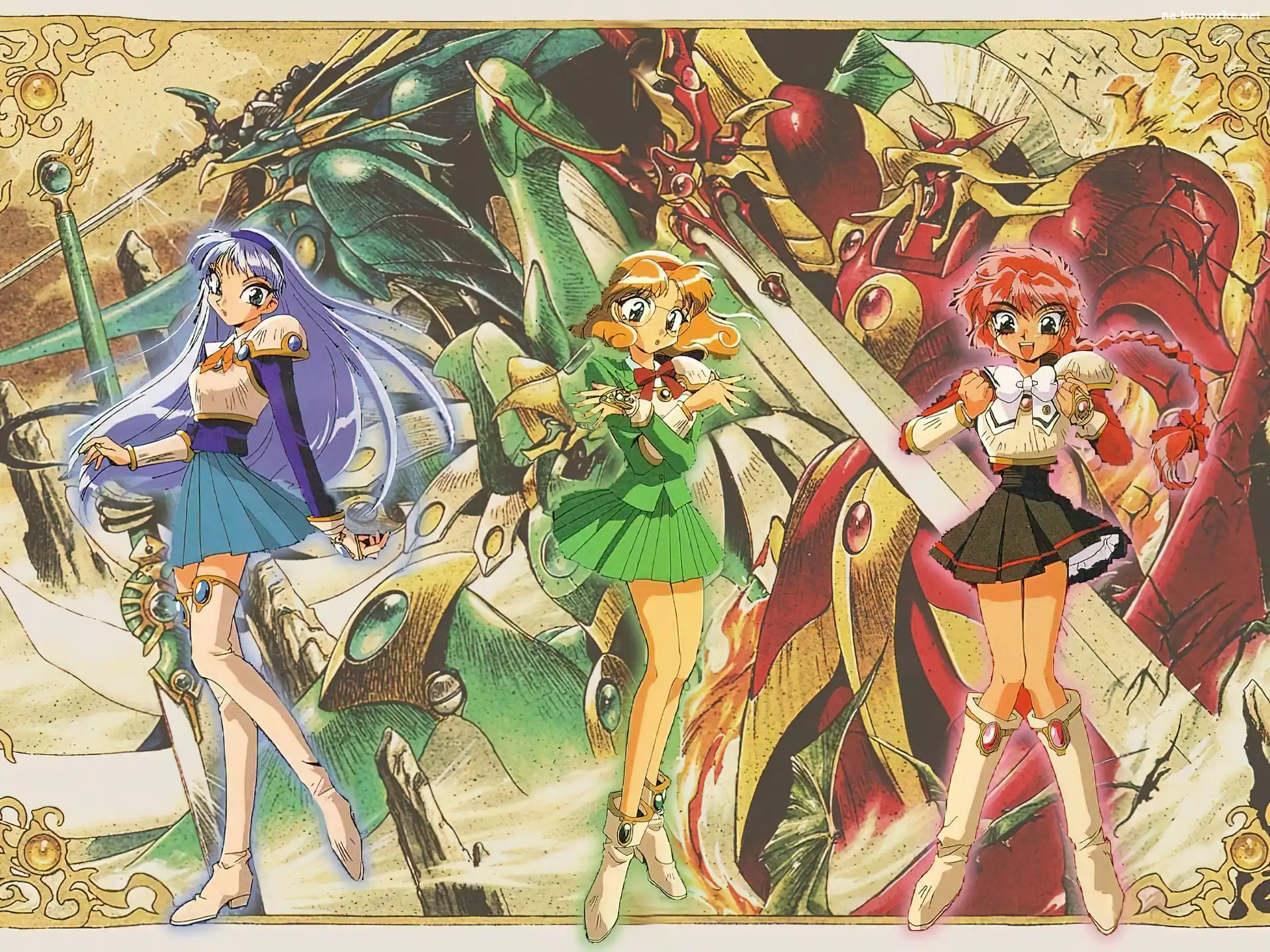 Magic Knight Rayearth, dziewczyny, pluszaki Magic Knight Rayearth, miecz, kobiety, księżyc Legendarna, Rayearth, Maszyna Magic Knight Rayearth, ludzie, smutek Hikaru, Lantis, Mokona Eagle, Geo, Lustro Magic Knight Rayearth, kobiety, miecz Hikaru, Delfin, Morze Fuu, Windam, Ptak Eagle, Mężczyzna, Ręka Lantis, Eagle, Drzewo narty, Magic Knight Rayearth, obrazy, ludzie, magia Magic Knight Rayearth, Zagato Magic Knight Rayearth, magia, kobieta