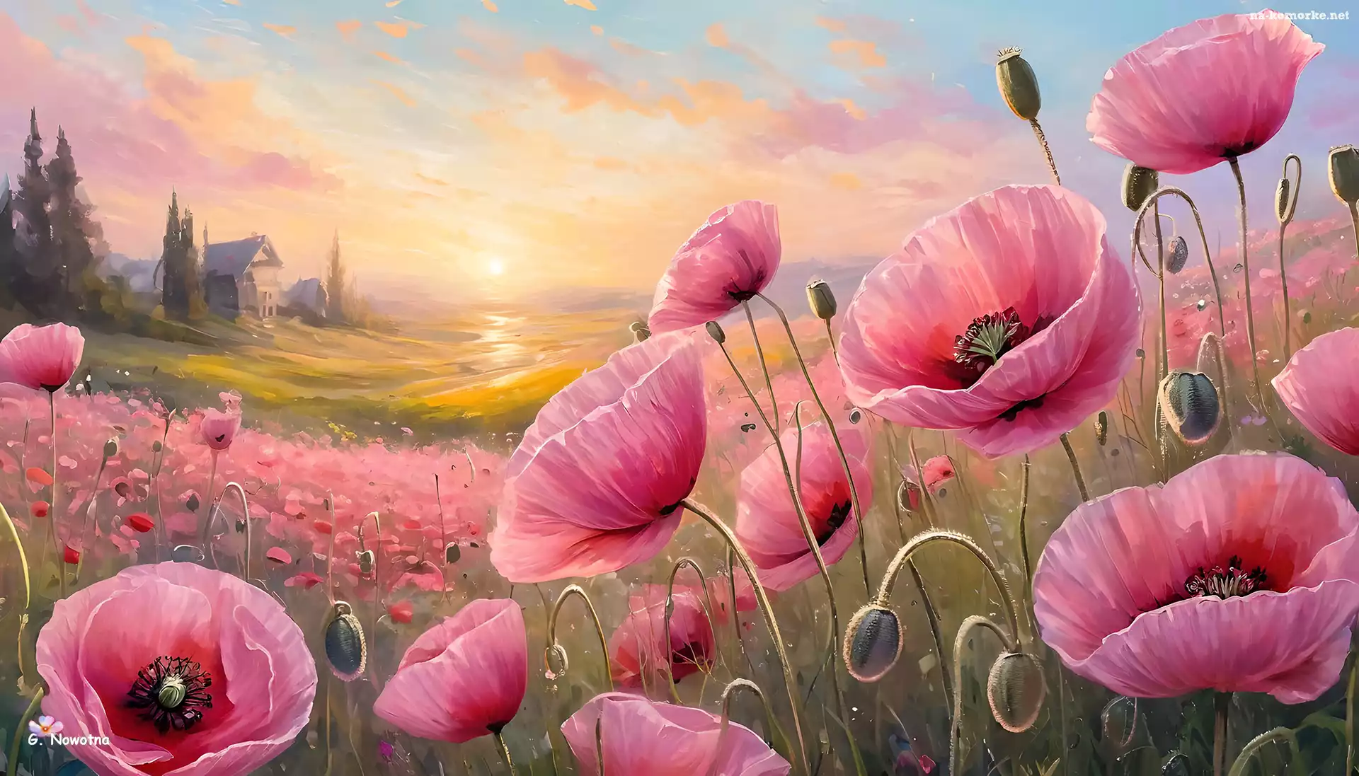 Łąka, Grafika, Różowe, Maki na Komórkę