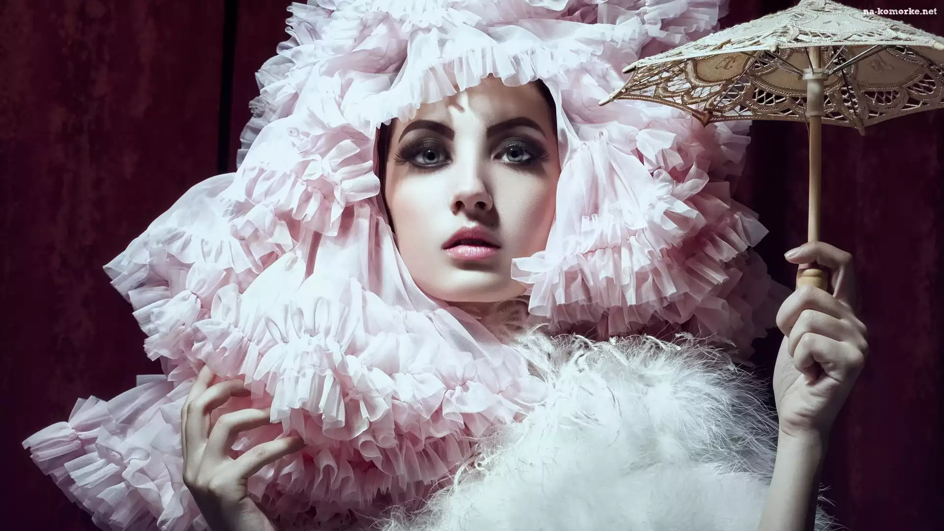 Jasnoróżowe, Mała, Głowy, Dziewczyna, Falbanki, Parasolka, Nakrycie, Makijaż na Komórkę