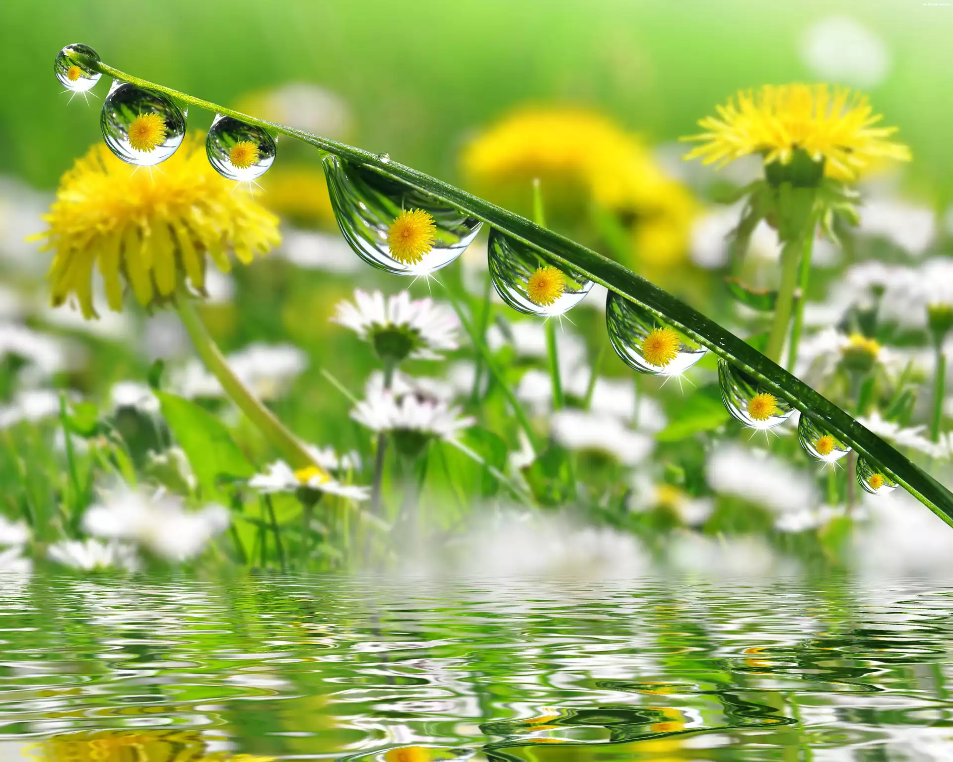 Makro, Mniszek, Pospolity, Krople, Rosy na Komórkę