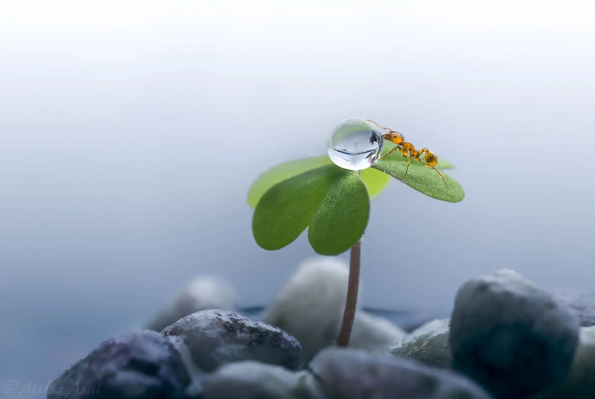 Makro, Koniczynka, Kropla, Mrówka, Kamyki na Komórkę