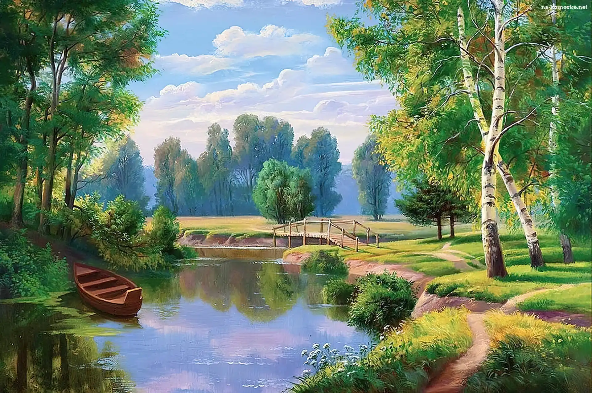 Malarstwo, Jezioro, Łódka, Drzewa, Widoczek na Komórkę