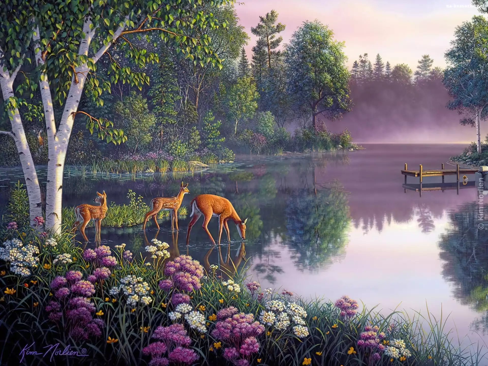 Widoczek, Malarstwo, Kim Norlien, Sarny, Kwiaty, Las, Jezioro na Komórkę