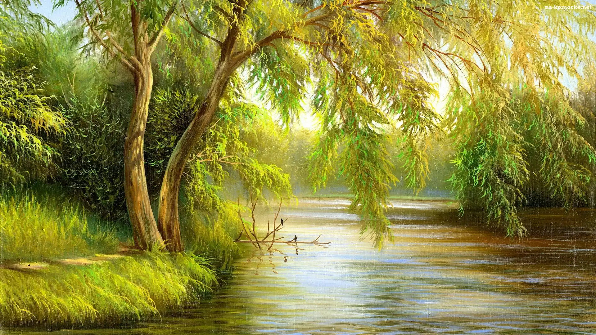 Malarstwo, Drzewa, Obraz, Rzeka na Komórkę