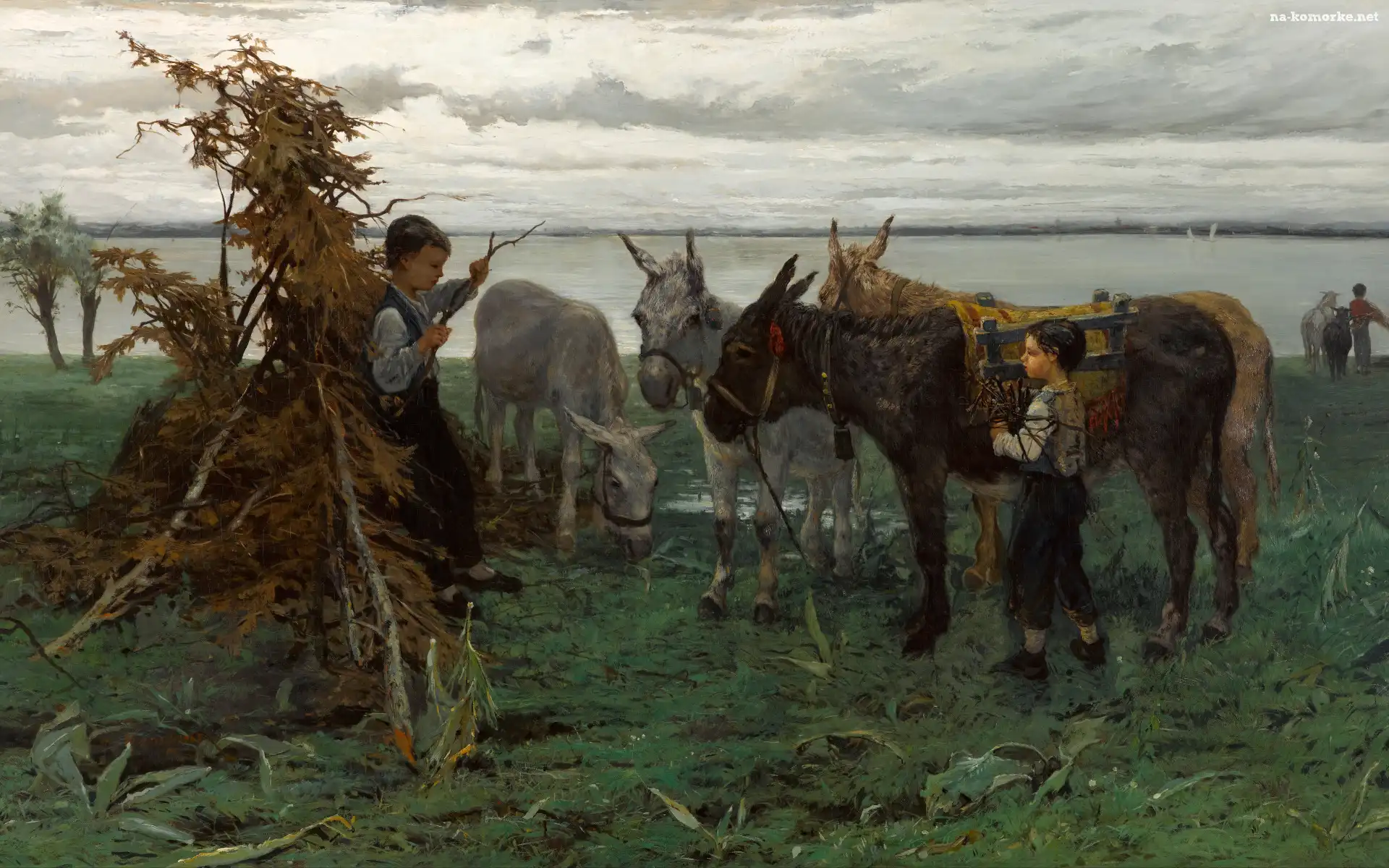 Dzieci, Malarstwo, Willem Maris, Chłopcy, Osły, Gałęzie, Obraz na Komórkę