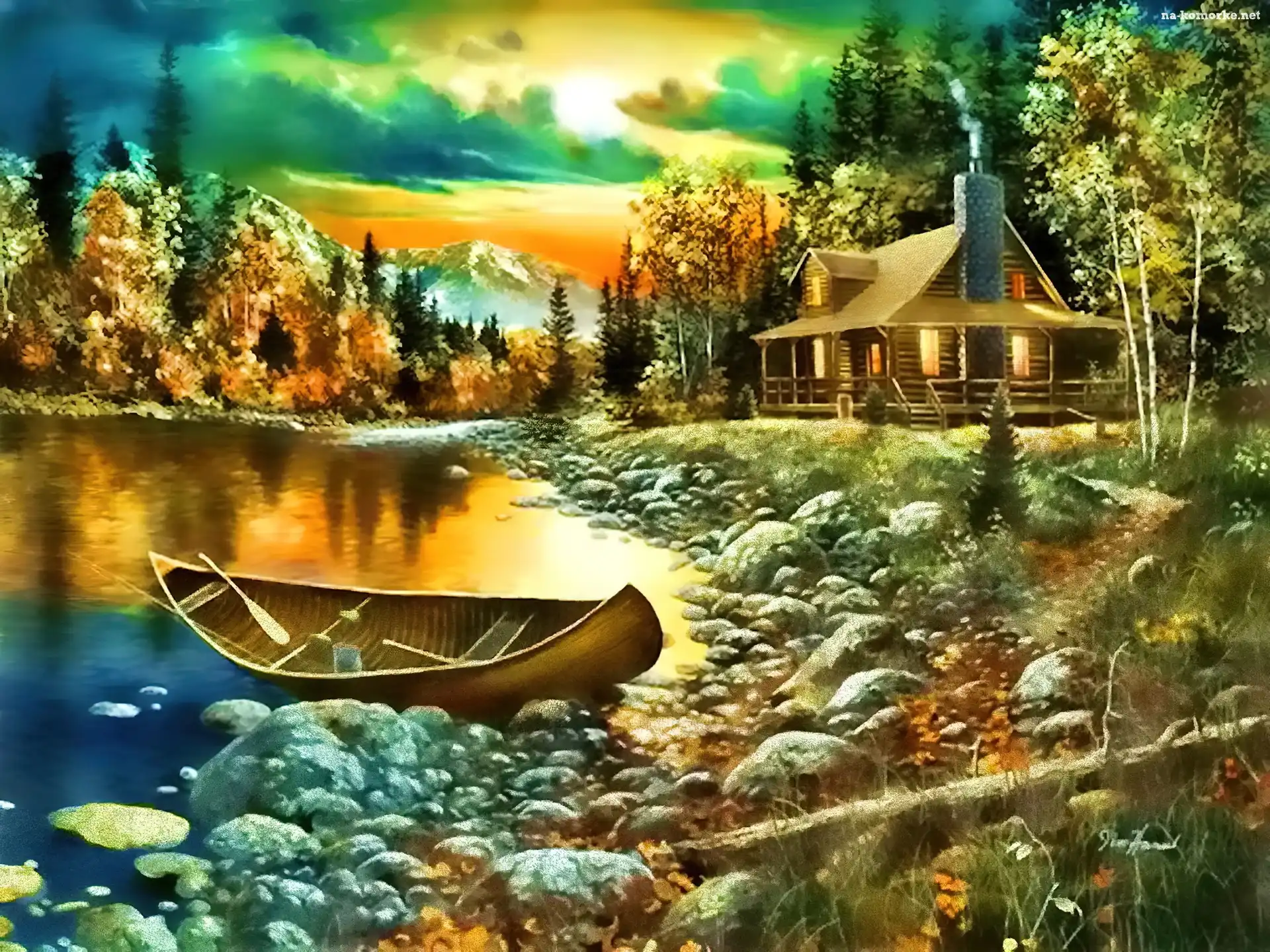 Malarstwo, Jezioro, Domek, Łódka, Widoczek na Komórkę