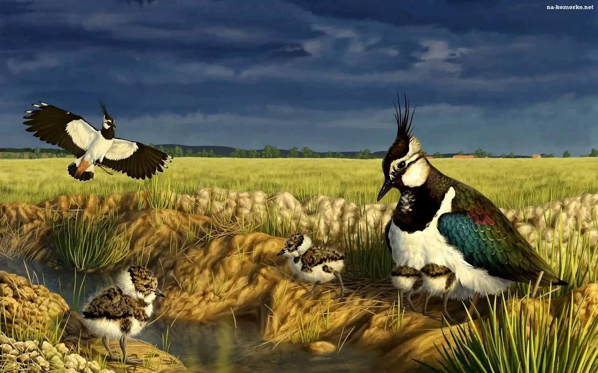 Malarstwo, Krajobraz, Ptaki, Pisklęta na Komórkę