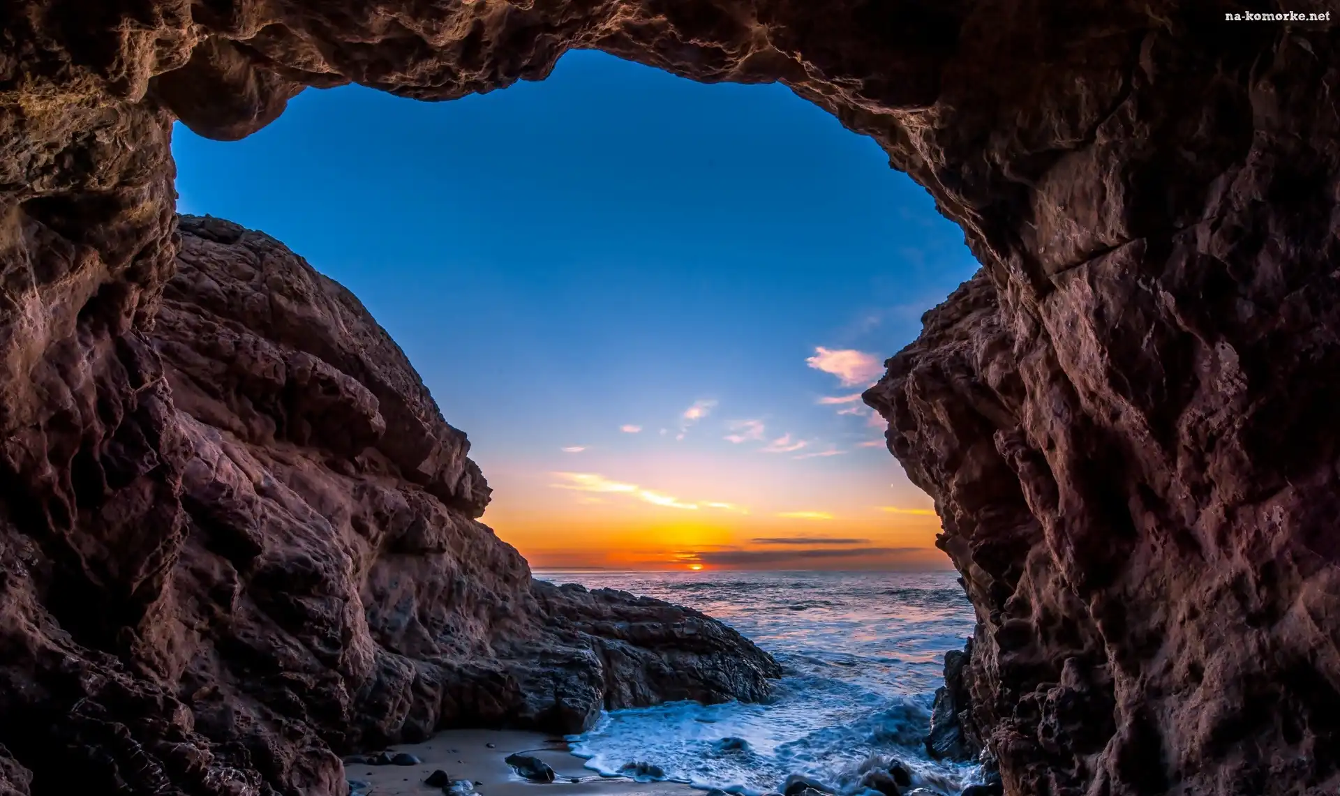 Jaskinia, Malibu, Wybrzeże, USA, Skały, Oceanu, Zachód, Słońca na Komórkę