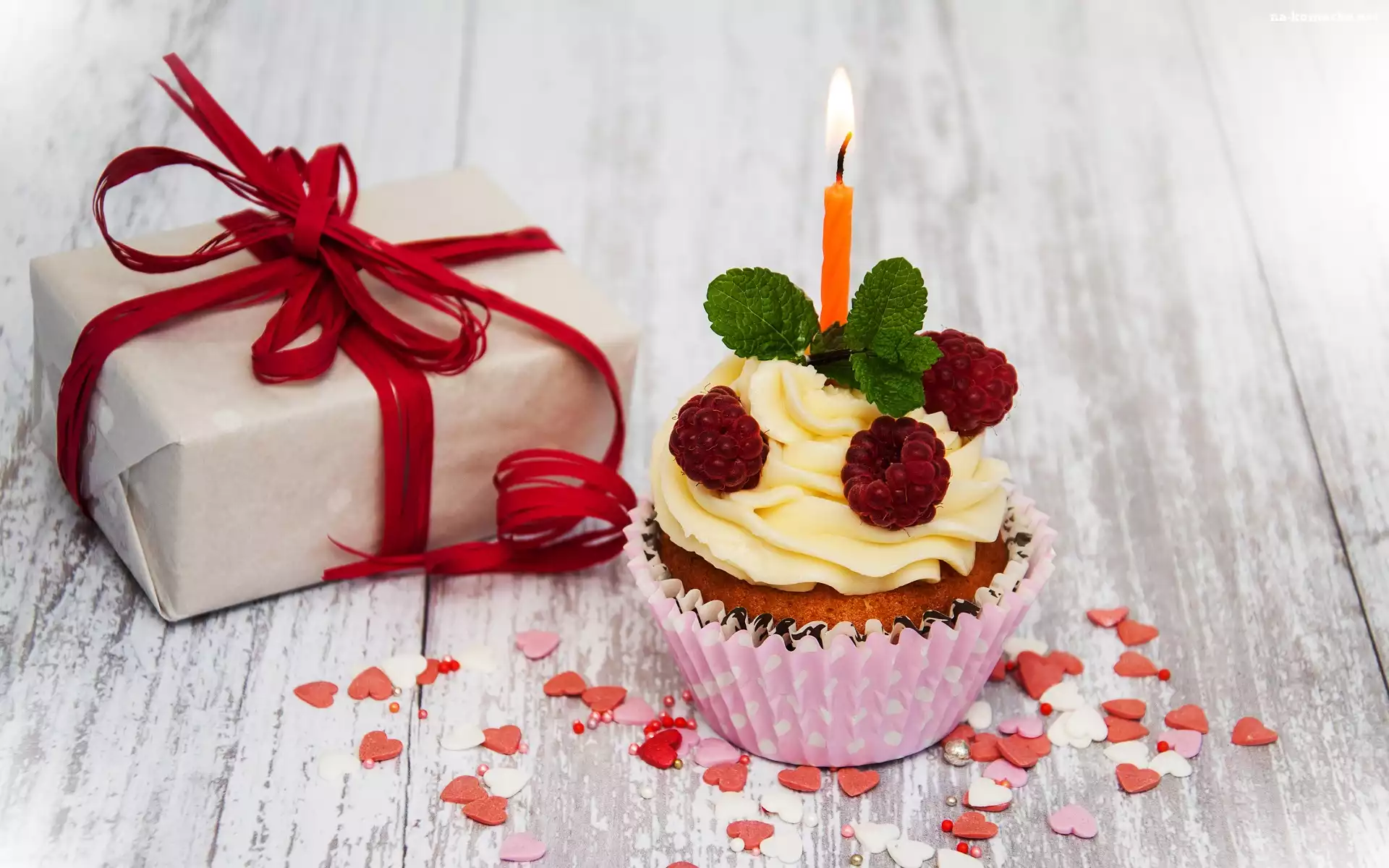 Maliny, Prezent, Urodziny, Serduszka, Babeczka, Świeczka na Komórkę