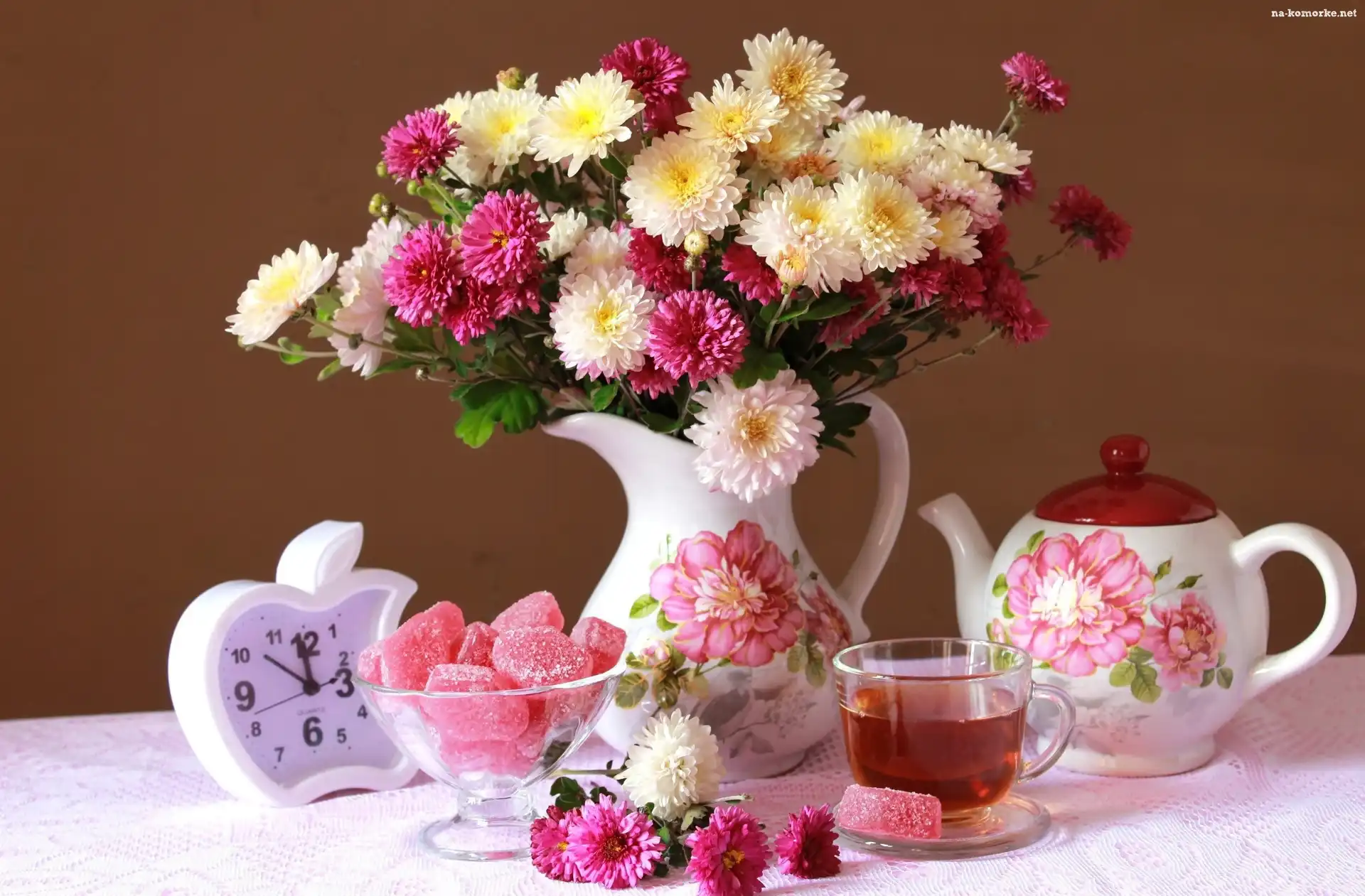 Bukiet, Martwa, Natura, Chryzantem, Dzbanuszki, Herbata, Słodycze na Komórkę
