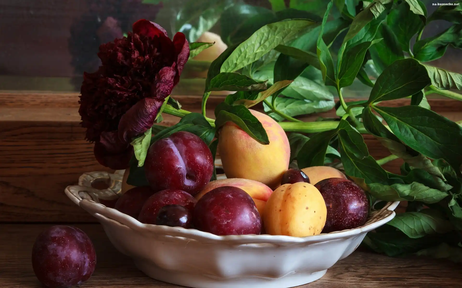 Martwa Natura, Śliwki, Morele, Piwonia, Kompozycja na Komórkę