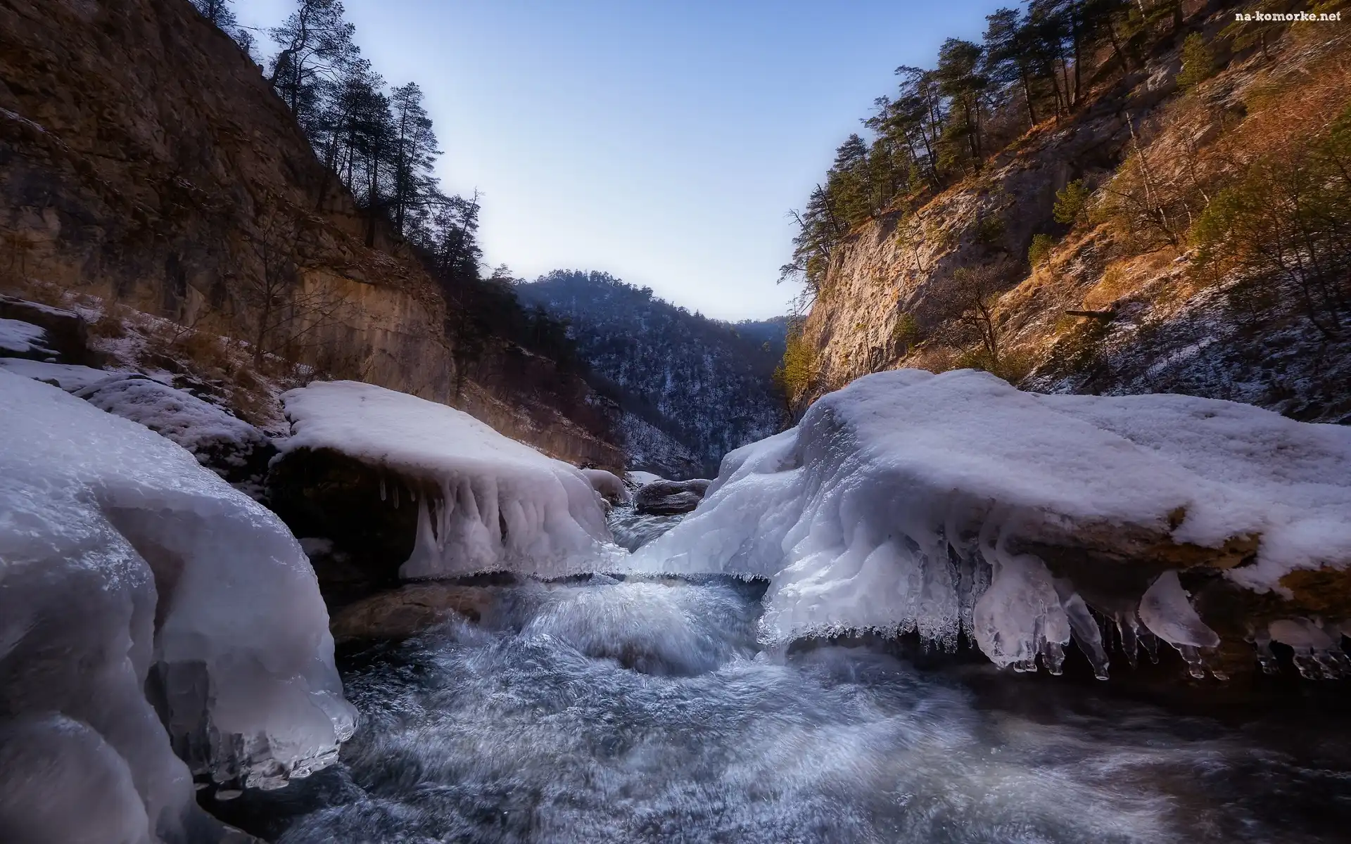 Wąwóz Marukh, Rosja, Skały, Rzeka Marukha, Zima, Karaczajo-Czerkiesja, Drzewa, Oblodzone, Lód na Komórkę |