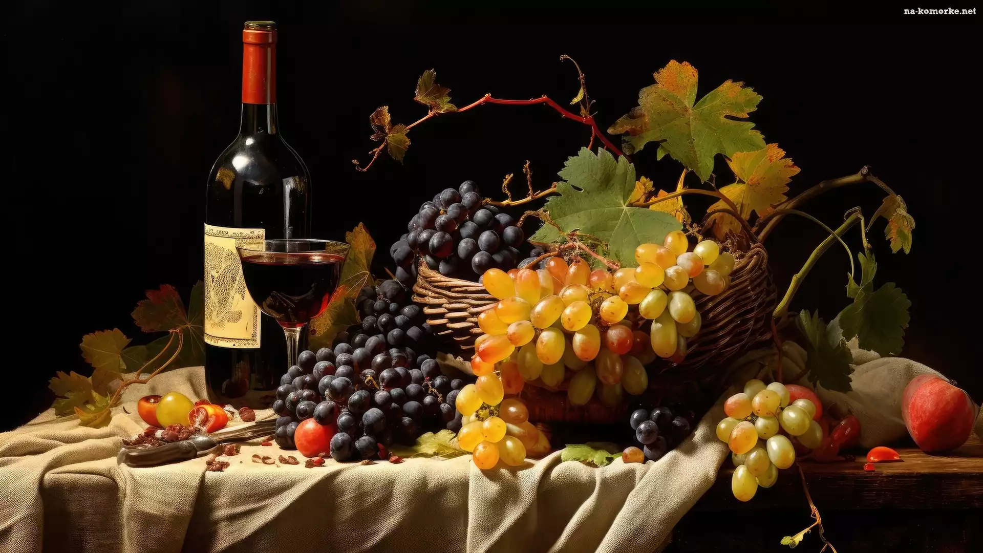 Wino, Liście, Kompozycja, Materiał, Kosz, Butelka, Winogrona na Komórkę