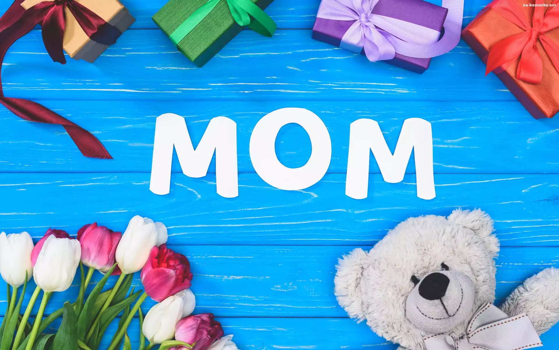 Prezenty, Kwiaty, Miś, Napis, Deski, Tulipany, Niebieskie, Mom, Dzień Matki na Komórkę