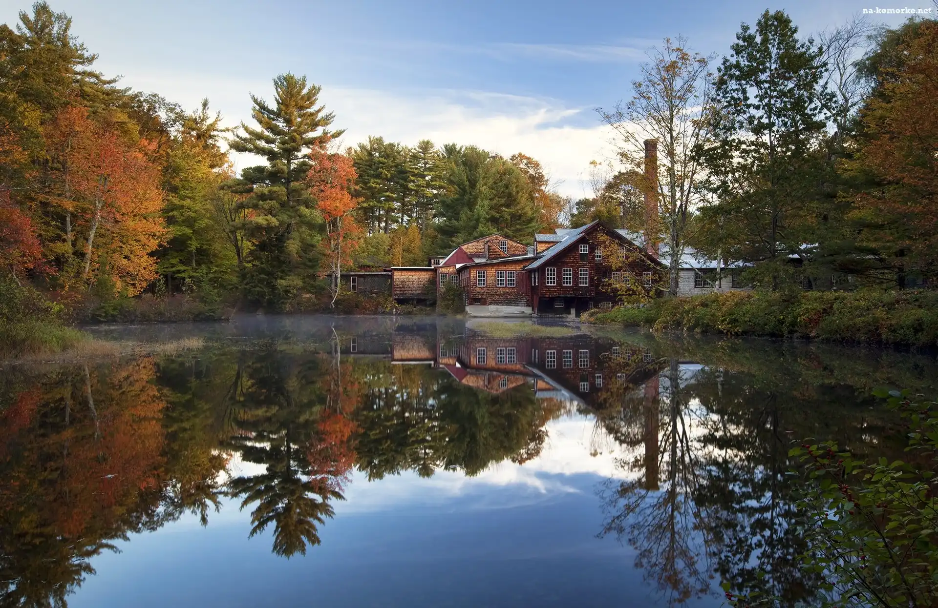 Stany Zjednoczone, Młyn Fryes Measure Mill, Wilton, Odbicie, Stan New Hampshire, Staw, Drzewa, Domy na Komórkę |