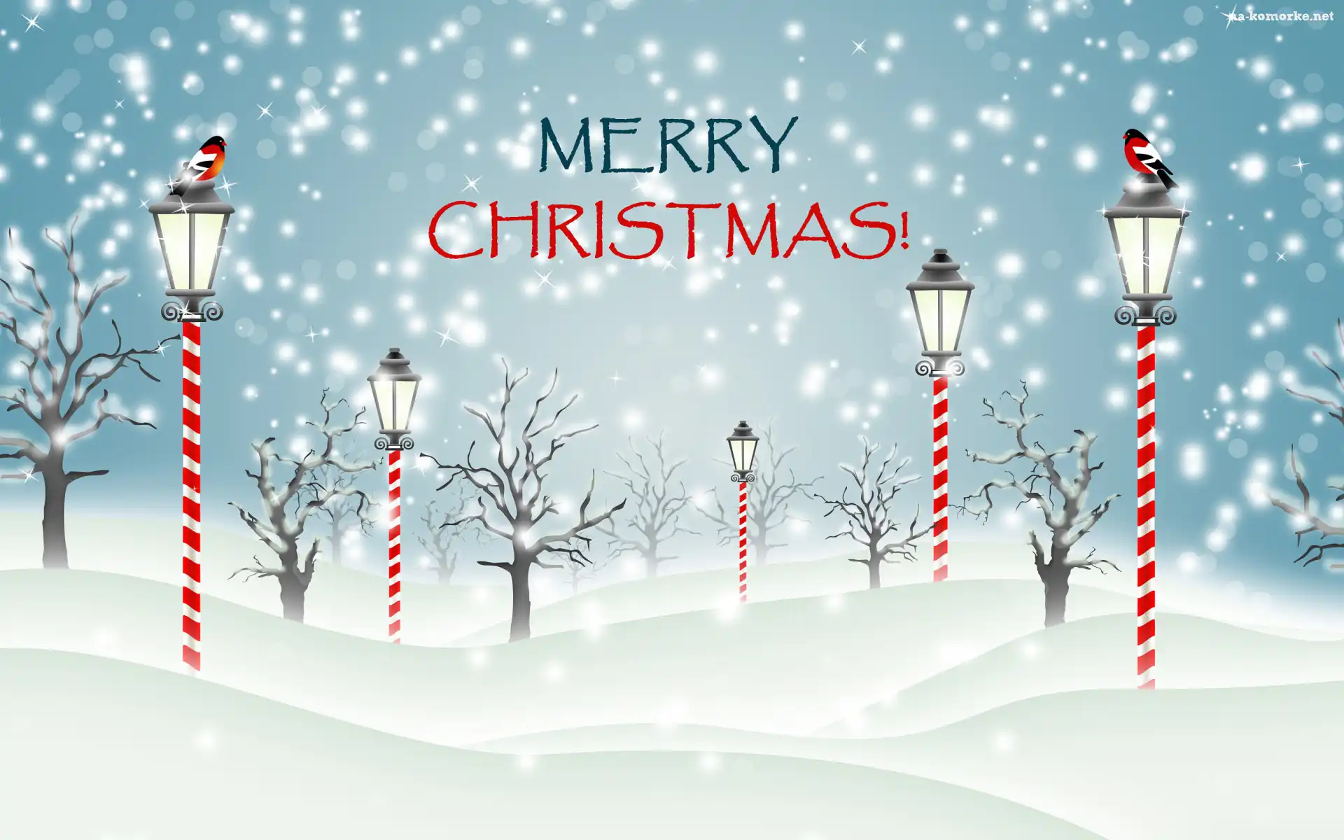 Drzewa, Merry Christmas, 2D, Latarnie, Ptaki, Śnieg, Napis na Komórkę