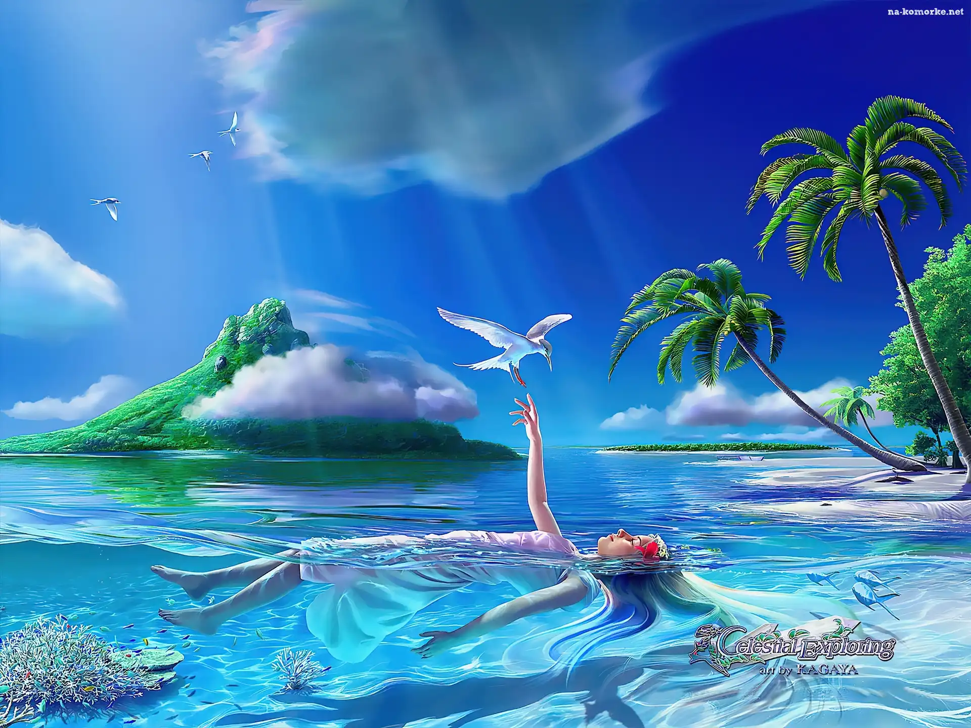 Palmy, Grafika, Mewa, Kagaya, Woda, Dziewczyna na Komórkę