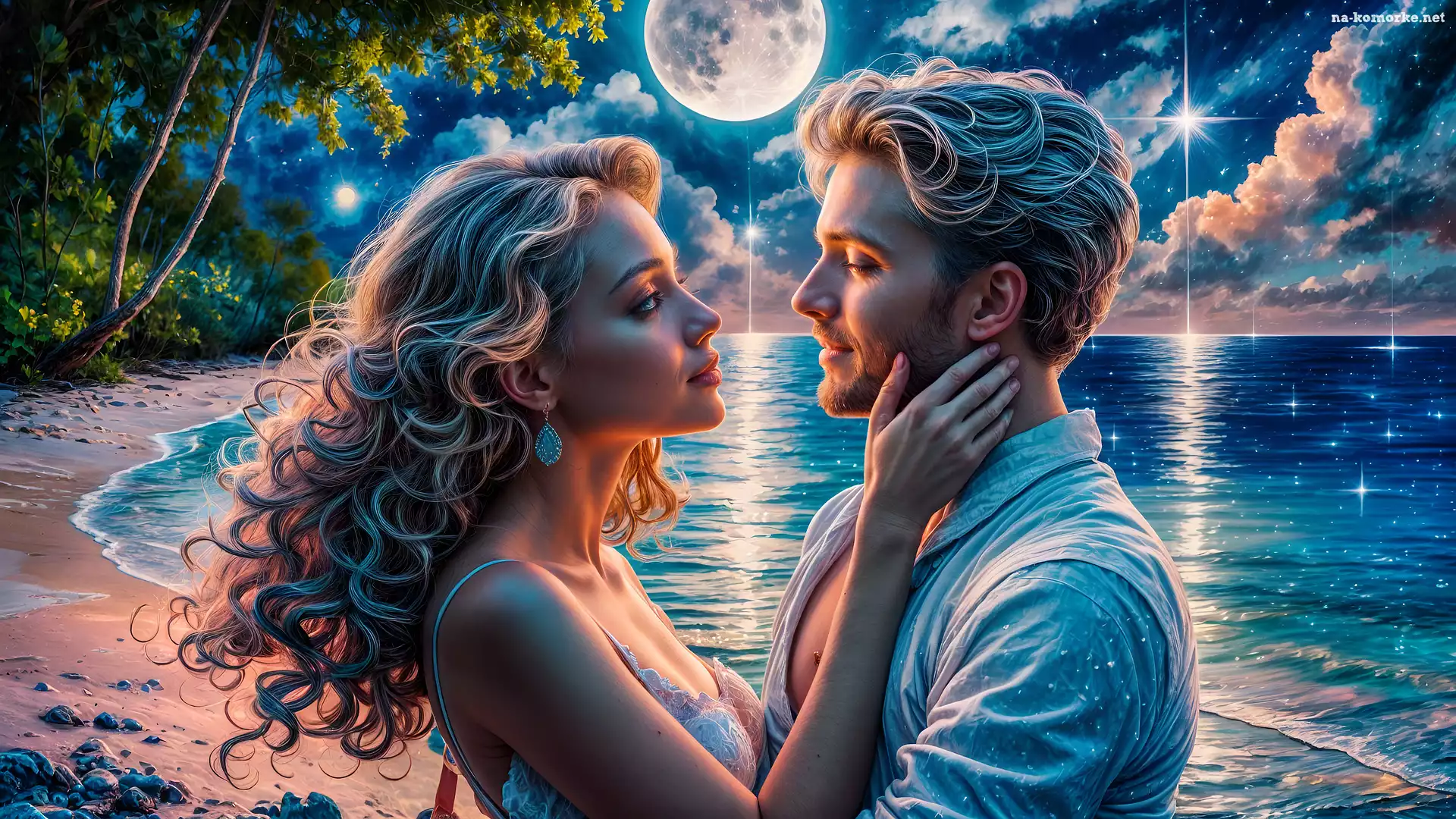 Para, Gwiazdy, Morze, Kobieta, Księżyc, Grafika, Zakochani, Mężczyzna na Komórkę