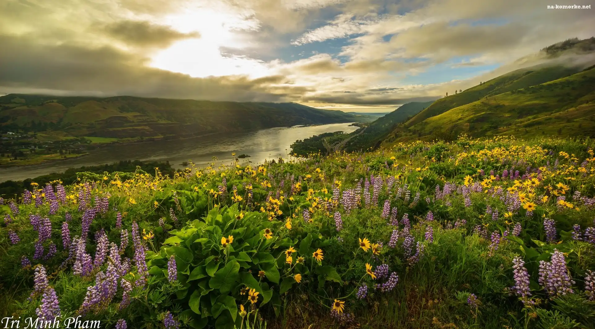 Mgła, Wzgórza, Kwiaty, Łąka, Rzeka na Komórkę